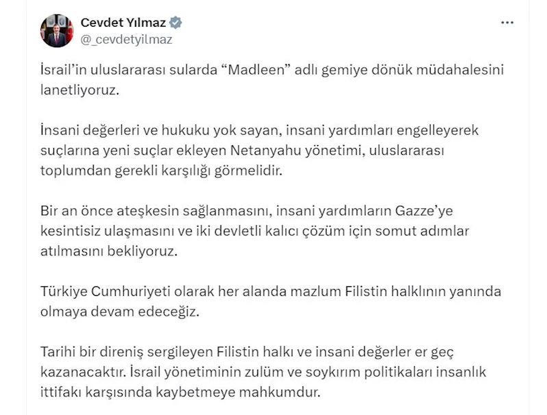 ANKARA, (DHA)- CUMHURBAŞKANI Yardımcısı Cevdet Yılmaz, "İsrail'in uluslararası sularda 'Madleen' adlı gemiye dönük müdahalesini lanetliyoruz. İnsani değerleri ve hukuku yok sayan, insani yardımları engelleyerek suçlarına yeni suçlar ekleyen Netanyahu yönetimi, uluslararası toplumdan gerekli karşılığı görmelidir" dedi.