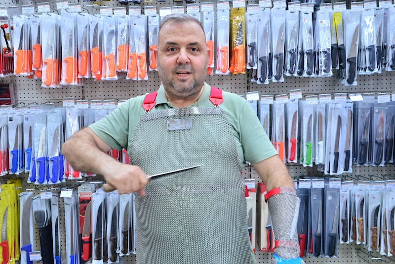 Kurban Bayramı’nda hastanelerin acil servisleri, kurban keserken kendilerini yaralayan acemi kasaplarla dolup taşarken, çözüm, bıçağıyla ünlü Bursa’dan geldi. Özel üretilen çelik eldiven ve çelik önlük ile kurbanlıkların karşısına adeta bir şövalye gibi çıkacak olan acemi kasaplar, bu sayede bayramı da hastanelerin acil servislerinde değil, evlerinde sevdikleriyle geçirebilecek. 80 yıldır bıçakçılık yapan ailenin ikinci kuşak işletmecisi olarak, Kurban Bayramı öncesi çelik önlük ile çelik eldivenleri satışa sunan Vedat Davran (52), ürünlerin yoğun talep gördüğünü söyledi.