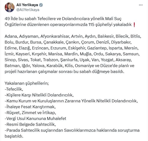 ANKARA, (DHA)- İÇİŞLERİ Bakanı Ali Yerlikaya, mali suç örgütlerine yönelik 49 ilde düzenlenen operasyonda 115 şüphelinin yakalandığını açıkladı.