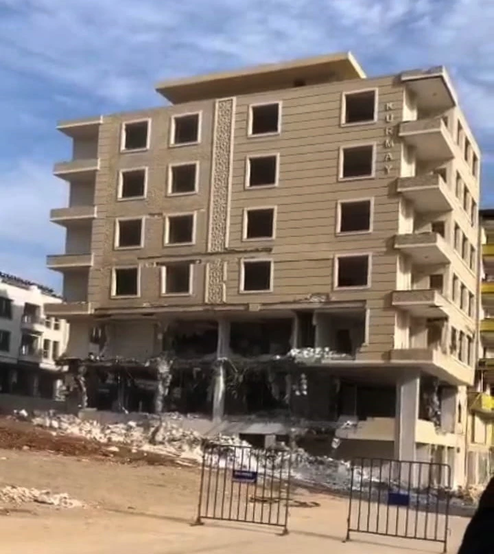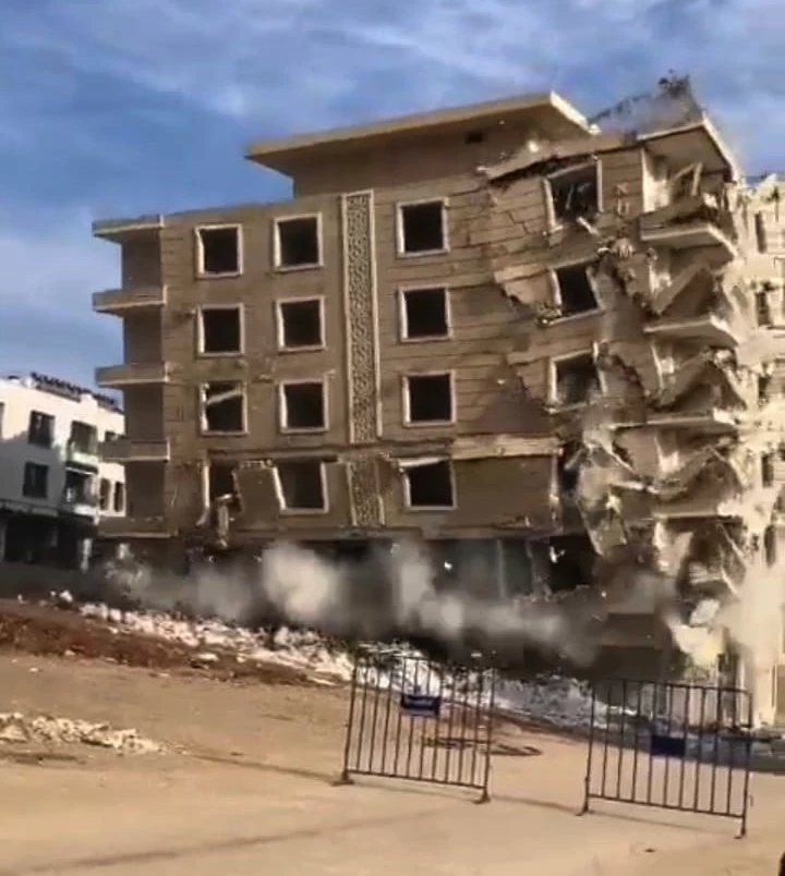 Kahramanmaraş merkezli depremlerden etkilenen İslahiye ilçesi Hacı Ali Öztürk Mahallesi'ndeki 5 katlı binanın, Çevre, Şehircilik ve İklim Değişikliği Bakanlığı ekipleri tarafından yapılan incelemesinde 'orta hasarlı' olduğu tespit edildi. Verilen yasal süre içerisinde güçlendirme ruhsatı alamayan binanın ağır hasarlıya dönmesiyle yıkım kararı verildi. Boşaltılan binanın yıkımı için ekipler, sabah saatlerinde çalışma başlattı. Çevrede bariyerlerle güvenlik önleminin alınmasının ardından iş makineleriyle yapılan kontrollü yıkım sırasında, bina aniden çöktü. Çevreyi toz bulutu sararken, binanın gürültüyle çöktüğü anlar ise çevredekiler tarafından cep telefonu kamerasıyla kaydedildi. (DHA)