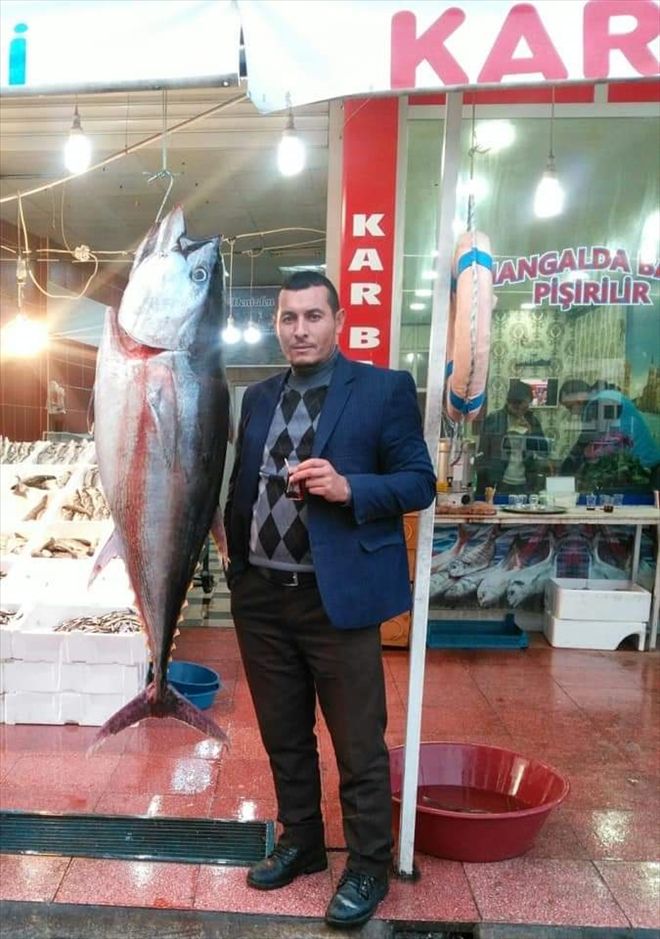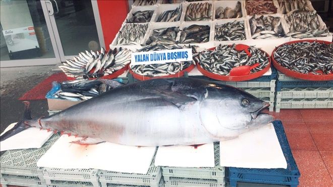 Kar Balıkçılık sahibi Serdar Kaya Aksaray´a getirdiği 200 kiloluk orkinos balığını tezgaha koydu.Balığın üzerine´ Yalan Dünya Boşmuş´ yazan Balıkçı Kaya, Aksarayl´ı vatandaşların ilk kez gördükleri 200 kiloluk balığa büyük ilgi gösterdiğini belirterek kilosu 30 TL den alıcı bularak kısa sürede tükendiğini kaydetti