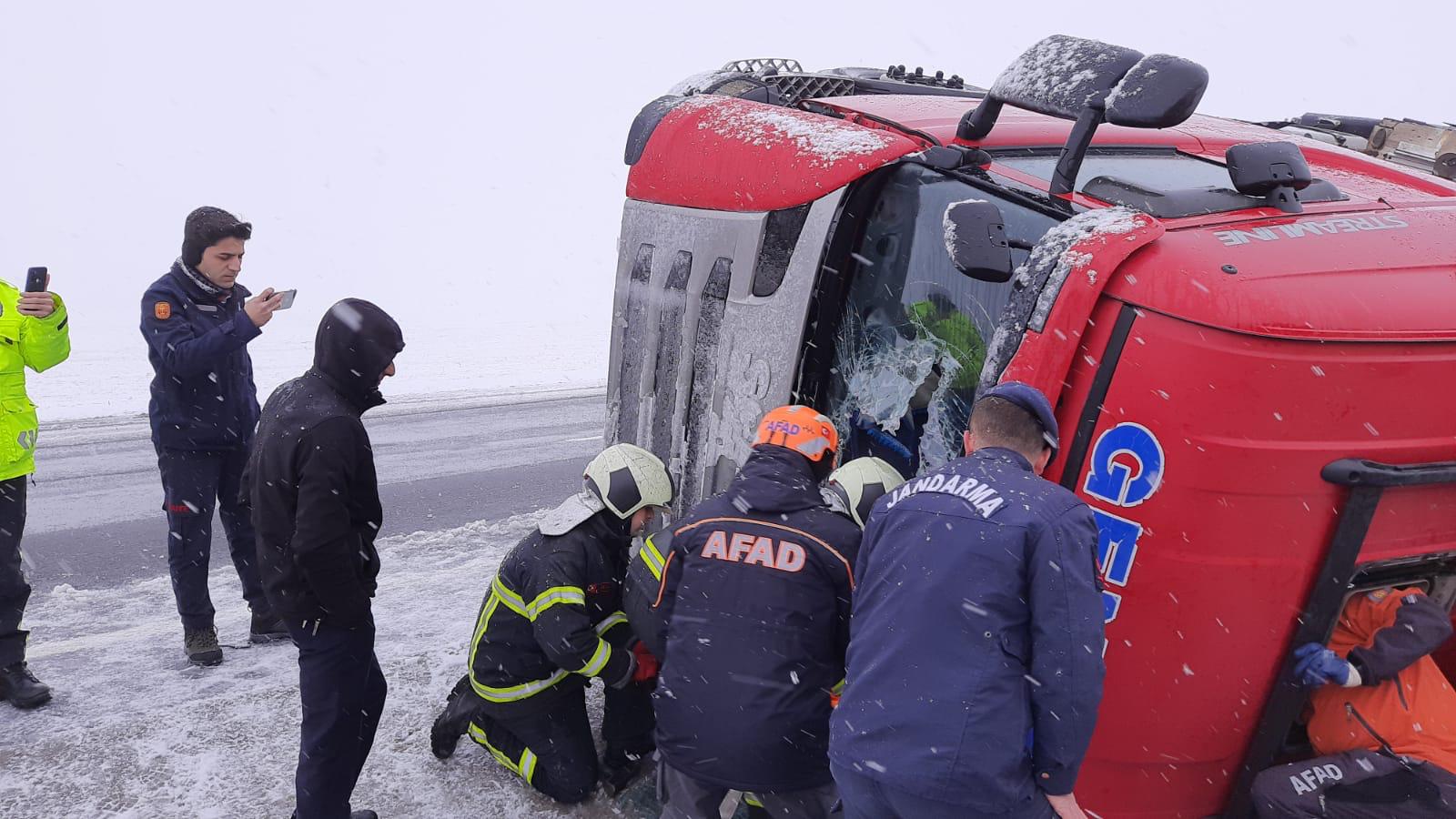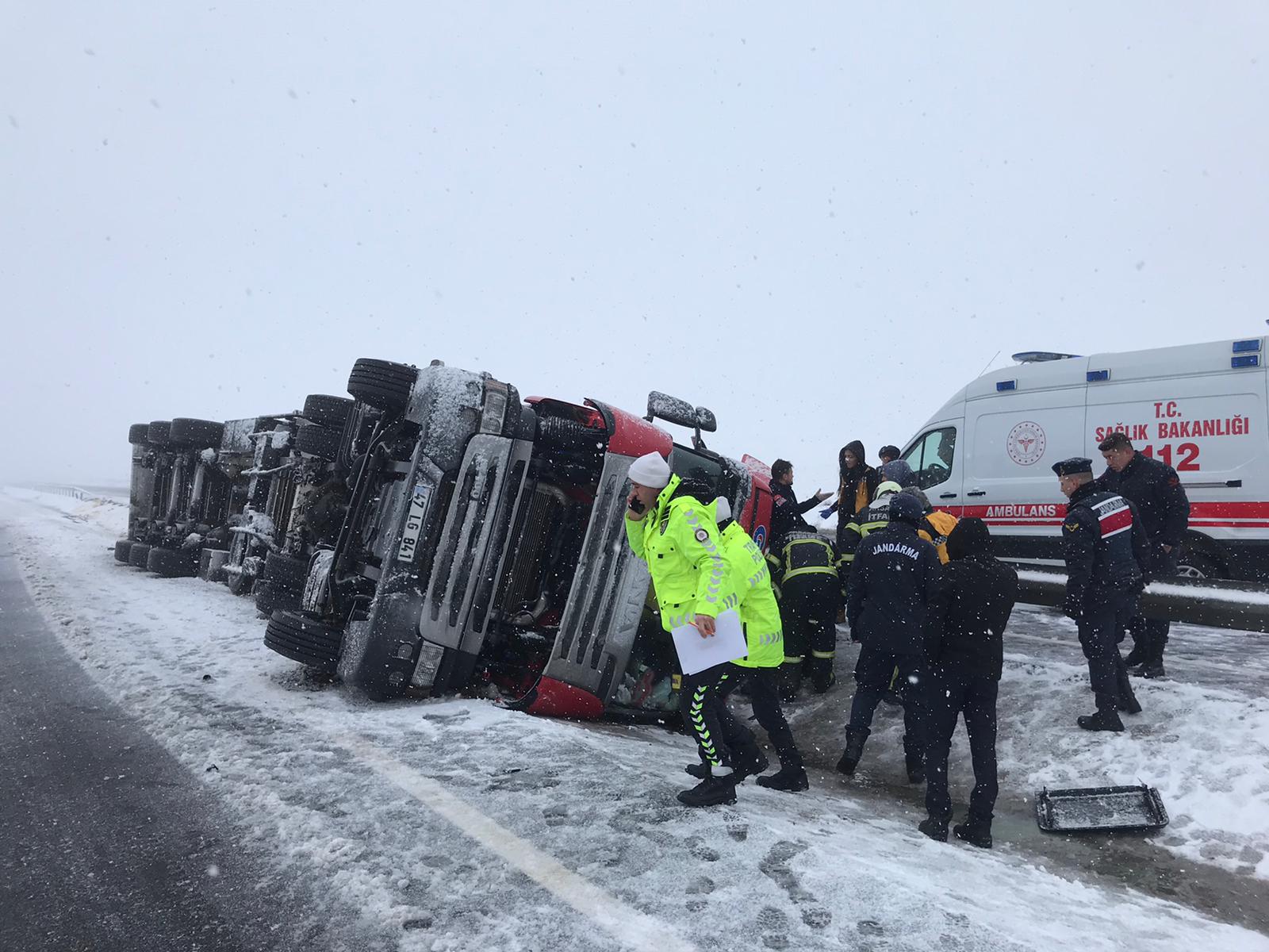 Aksaray'da Olumsuz hava koşulları ve Kar yağışı nedeniyle meydana gelen Tır kazasında biri hamile iki kişi yaralandı.