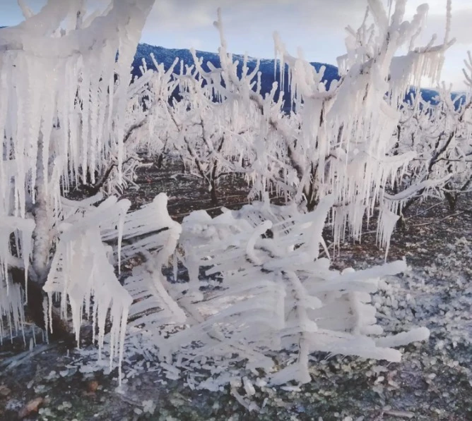 Kentte 1 haftadır etkili olan soğuk hava, meyve yetiştiricilerinin faaliyetlerini de olumsuz etkiledi. Hava sıcaklığının eksi 9 dereceye kadar düşmesi sonucu, çiftçi, ağaçların zarar görmesini önlemek amacıyla fıskiyeyle su sıktı. Yaşanan don sonucu ağaçların dallarında sarkıtlar oluştu.
