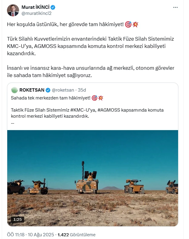 ROKETSAN, 360 derece dönüş özelliği ve araç içerisinden kontrol edilebilen stabilize taret sistemi ile hem durarak hem de hareket yeteneğine sahip KMC-U'nun geliştirilmesine yönelik çalışmalarını sürdürüyor. Bu kapsamda KMC-U'ya, komuta kontrol merkezi kabiliyeti kazandırıldı. ROKETSAN Genel Müdürü Murat İkinci, gerçekleştirilen test faaliyetine ilişkin görüntüleri sosyal medya hesabından paylaşarak, "Her koşulda üstünlük, her görevde tam hakimiyet. Türk Silahlı Kuvvetlerimizin envanterindeki taktik füze silah sistemimiz KMC-U'ya, AGMOSS kapsamında komuta kontrol merkezi kabiliyeti kazandırdık. İnsanlı ve insansız kara hava unsurlarında ağ merkezli, otonom görevler ile sahada tam hakimiyet sağlıyoruz" dedi. (DHA)