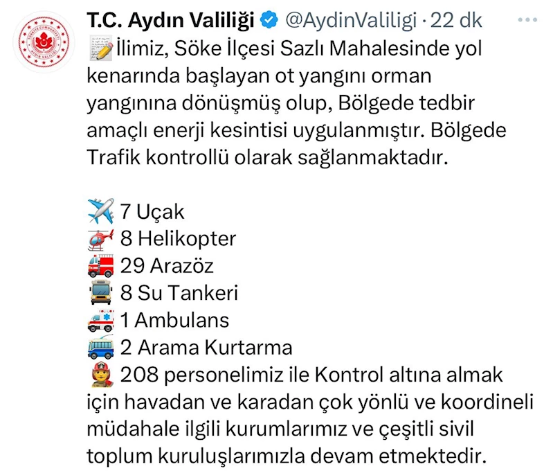 Aydın’ın Söke ilçesinde saat 16.00 sıralarında çıkan maki yangını rüzgarın da etkisiyle kısa sürede ormana sıçradı. Yangınla ilgili Aydın Valiliği sosyal medya hesabından açıklama yaptı. Açıklamada, “İlimiz, Söke İlçesi Sazlı Mahalesinde yol kenarında başlayan ot yangını orman yangınına dönüşmüş olup, Bölgede tedbir amaçlı enerji kesintisi uygulanmıştır. Bölgede Trafik kontrollü olarak sağlanmaktadır. 7 uçak, 8 helikopter, 29 arazöz, 8 su tankeri, 1 ambulans, 2 arama kurtarma, 208 personelimiz ile kontrol altına almak için havadan ve karadan çok yönlü ve koordineli müdahale ilgili kurumlarımız ve çeşitli sivil toplum kuruluşlarımızla devam etmektedir" denildi. (DHA)
