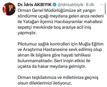 Muğla Valisi İdris Akbıyık, kaza- kırıma uğrayan uçak ile ilgili sosyal medya hesabından yaptığı açıklamada, “Orman Genel Müdürlüğümüze ait yangın söndürme uçağı meydana gelen arıza nedeni ile Yatağan ilçemiz Hacıbayramlar Mahallesi Sepetçi mevkiinde boş araziye acil iniş yapmıştır. Pilotumuz sağlık kontrolleri için Muğla Eğitim ve Araştırma Hastanesi'ne sevk edilmiş olup alınan ilk bilgilere göre hayati tehlikesi bulunmamaktadır. Sert inişin etkisi ile uçakta da hasar meydana gelmiştir. Orman teşkilatımıza ve milletimize geçmiş olsun dileklerimizi iletiyoruz" ifadelerini kullandı. (DHA)