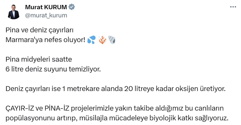 ANKARA, (DHA)- ÇEVRE, Şehircilik ve İklim Değişikliği Bakanı Murat Kurum, ÇAYIR-İZ ve PİNA-İZ projeleri ile Marmara Denizi'nde pina midyeleri ve deniz çayırlarının popülasyonunu artırarak, müsilajla mücadeleye biyolojik katkı sağladıklarını açıkladı.
