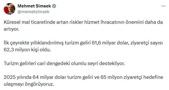 Hazine ve Maliye Bakanı Mehmet Şimşek, 1'inci çeyrek turizm geliri istatistiklerine ilişkin sosyal medya hesabından yaptığı açıklamada, "Küresel mal ticaretinde artan riskler hizmet ihracatının önemini daha da artıyor. İlk çeyrekte yıllıklandırılmış turizm geliri 61,6 milyar dolar, ziyaretçi sayısı 62,3 milyon kişi oldu. Turizm gelirleri cari dengedeki olumlu seyri destekliyor. 2025 yılında 64 milyar dolar turizm geliri ve 65 milyon ziyaretçi hedefine ulaşmayı öngörüyoruz" ifadelerini kullandı. (DHA)