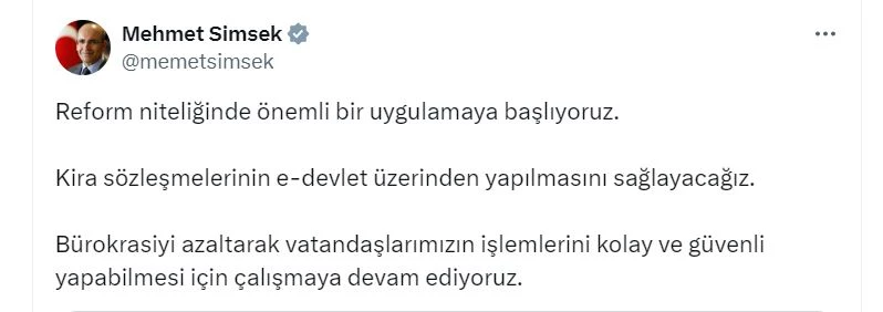 ANKARA, (DHA)- HAZİNE ve Maliye Bakanı Mehmet Şimşek, "Reform niteliğinde önemli bir uygulamaya başlıyoruz. Kira sözleşmelerinin e-Devlet üzerinden yapılmasını sağlayacağız" dedi.