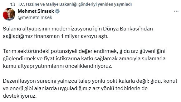 Hazine ve Maliye Bakanı Mehmet Şimşek, sosyal medya hesabından yaptığı açıklamada, "Sulama altyapısının modernizasyonu için Dünya Bankası'ndan sağladığımız finansman 1 milyar avroyu aştı. Tarım sektöründeki potansiyeli değerlendirmek, gıda arz güvenliğini güçlendirmek ve fiyat istikrarına katkı sağlamak amacıyla sulamada kamu altyapı yatırımlarını önceliklendiriyoruz. Dezenflasyon sürecini yalnızca talep yönlü politikalarla değil; gıda, konut ve enerji gibi alanlarda uyguladığımız arz yönlü tedbirlerle de destekliyoruz" ifadelerini kullandı. (DHA)