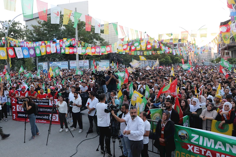 Türkiye'de barıştan başka şansın olmadığını belirten Bakırhan, "40 değil 400 yıl geçse de Türkiye'de barıştan başka bir şansımız yok. 40 yıl bu ülkenin enerjisi, ekonomisi boşa harcandı. On binlerce insanımız yaşamını yitirdi. Gençlerimizin tabutlarını kaldırmak zorunda kaldık. Ama geldiğimiz nokta çatışmanın, şiddettin, baskının inkarın çare olmadığını ortaya koydu. Onun için Öcalan'ın kapısını araladı. Bu barış sürecini başarıya ulaştırarak gençlerimizin yaşamını yitirmesini engelleyebiliriz. Bu ülkenin ekonomisine, enerjisini, demokrasi için daha iyi bir ekonomi için harcayabiliriz. Bu süreç bizim için çok kıymetlidir. Türkiye'nin dört bir yanında bugün burada olduğu gibi mitingler yapıyoruz, buluşmalar yapıyoruz. Barışa olan inancımızı ortaya koyuyoruz. Barış konusunda ne kadar samimi olduğumuzu gösteriyoruz. Geçmişin kaygılarıyla, acılarıyla davranmıyoruz. Barış, kaygıları, acıları unutmadan bir kenara koyarak geleceği inşa etmektir" dedi.