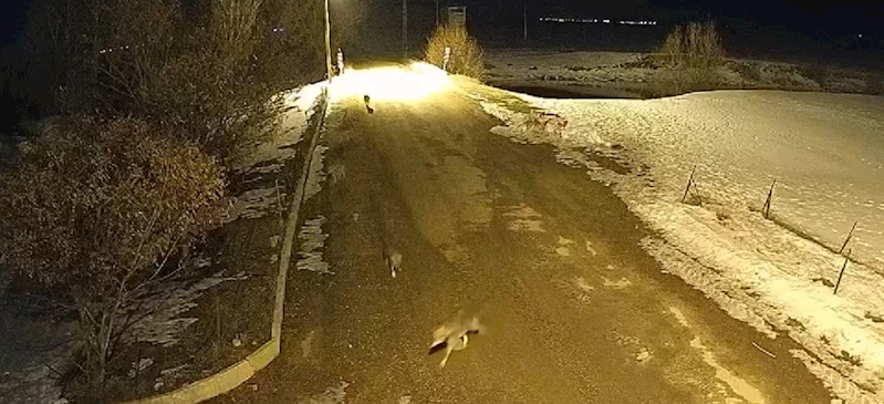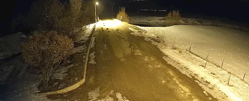 Murat SÖYLEMEZ/BAYBURT, (DHA)- BAYBURT'ta, karla kaplanan doğal yaşam alanlarında yiyecek bulamayıp, aç kalan kurt sürüsü köye indi. Kurtların sürü halinde yiyecek arayışı, güvenlik kameralarına yansıdı.