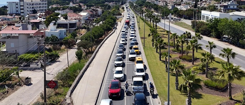 Oğuzhan BOYSAN/KUŞADASI (Aydın), (DHA)- AYDIN'ın Kuşadası ilçesine 24 saatte 60 binden fazla araç giriş yaptı. Tatilci akınına uğrayan ilçedeki kilometrelerce araç kuyruğu, dronla görüntülendi.