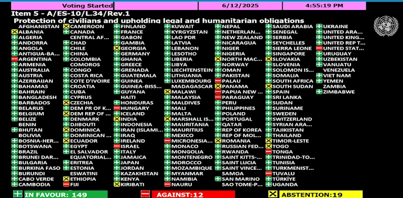 Birleşmiş Milletler Genel Kurulu'nun (BMGK) bugün yapılan olağanüstü toplantısında, 'Gazze'de derhal, koşulsuz ve kalıcı bir ateşkes, tüm rehinelerin serbest bırakılması ve kıtlığı önlemek için insani yardımın yeniden başlatılması talep eden tasarısı' oylandı. Oylamada, 193 üye ülkeden 149'u 'evet' oyu ile tasarıya desteklerken, 12 ülke karşı çıktı, 19 ülke ise çekimser kaldı.