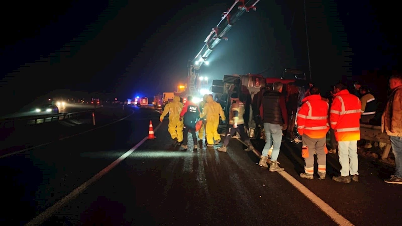 Bursa’nın İnegöl ilçesinde karşı şeride geçen asit yüklü tankerin devrilmesi sonucu araçta sıkışarak hayatını kaybeden şoför Kıyasettin Kara’nın cansız bedeni, AFAD ekiplerince bulunduğu yerden çıkarılarak İnegöl Devlet Hastanesi’nin morguna kaldırıldı. (DHA)
