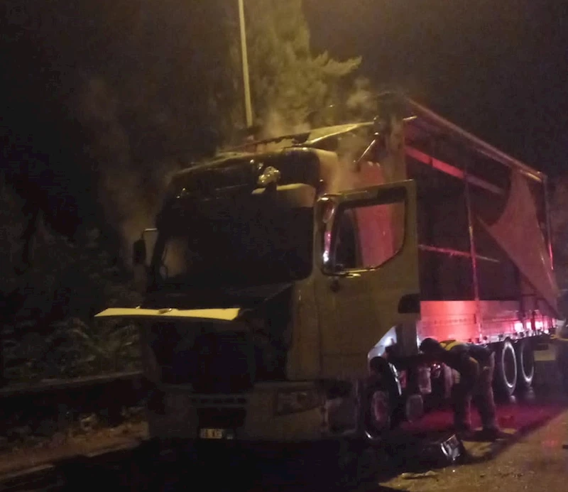 Yangında TIR'ın bir kısmında hasar meydana gelirken, çıkış nedeninin belirlenmesi için çalışma başlatıldı. (DHA)