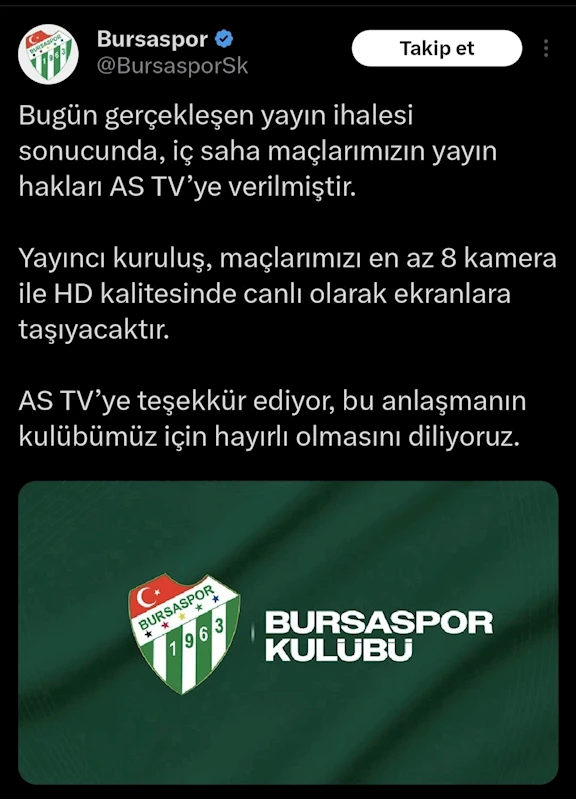 Konuyla ilgili Bursaspor’un resmi sosyal medya hesabından yapılan paylaşımda, “Bugün gerçekleşen yayın ihalesi sonucunda, iç saha maçlarımızın yayın hakları AS TV’ye verilmiştir. Yayıncı kuruluş, maçlarımızı en az 8 kamera ile HD kalitesinde canlı olarak ekranlara taşıyacaktır. AS TV’ye teşekkür ediyor, bu anlaşmanın kulübümüz için hayırlı olmasını diliyoruz” ifadeleri yer aldı.