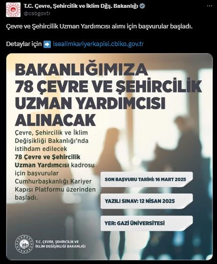 Gizem CENGİL/ANKARA, (DHA)- ÇEVRE, Şehircilik ve İklim Değişikliği Bakanlığı, 78 çevre ve şehircilik uzman yardımcısı alımına ilişkin başvuruların başladığını açıkladı.
