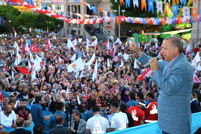 "Bu örnekleri şunun için veriyorum; AK Parti sadece konuşan, sadece vaatte bulunan bir parti değildir. AK Parti verdiği her sözün arkasında duran, söylediğini yapan bir partidir. Bunun için 24 Haziran seçimlerinde de sadece yapacağımız şeyleri söylüyoruz. Öyle uzayda altın bulma gibi uçuk, kaçık vaatlerimiz yok. Alın terimizle emeğimizle bileğimizle ne yapabileceksek onu söylüyoruz. Bir ´yerli marka otomobil´ diyoruz, ´Kanal İstanbul´ diyoruz, ´millet bahçeleri´ diyoruz. Biz ´hızlı tren hatları´ diyoruz. ´Barajlar sulama tesisleri, köprüler yollar´ diyoruz."
