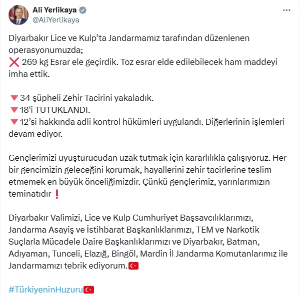 ANKARA, (DHA)- İÇİŞLERİ Bakanı Ali Yerlikaya, Diyarbakır'ın Lice ve Kulp ilçelerinde 269 kilogram esrar ele geçirilirken, toz esrar ham maddesinin imha edildiğini, gözaltına alınan 34 şüpheliden 18'inin tutuklandığını açıkladı.