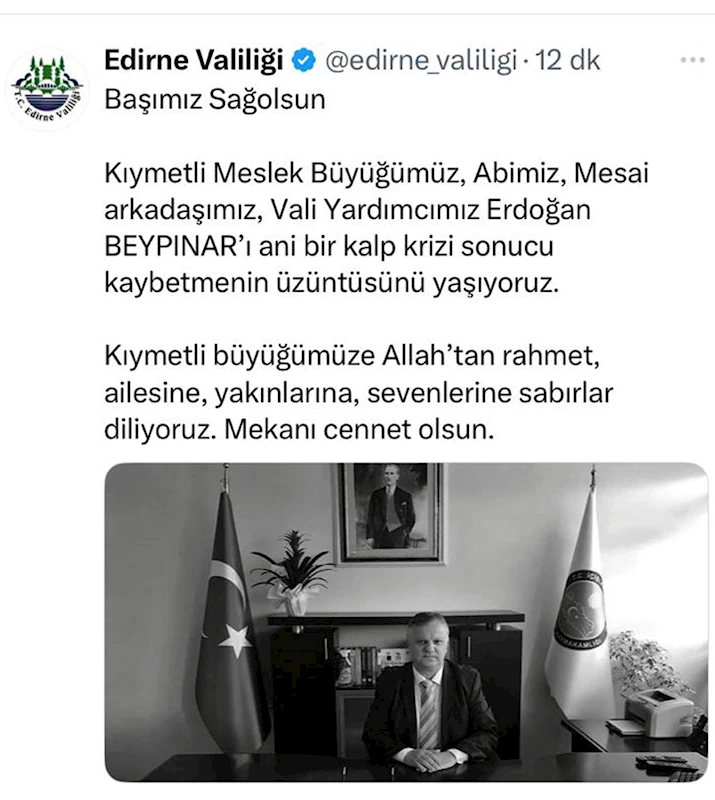 EDİRNE, (DHA)- EDİRNE Vali Yardımcısı Erdoğan Beypınar (59), geçirdiği kalp krizi sonucu hayatını kaybetti.