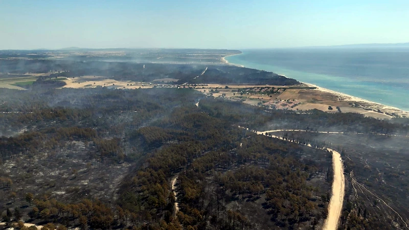 Edirne’nin Enez ilçesinde 16 saat sonra kontrol altına alınan orman yangınında etkilenen alan, havadan görüntülendi. Yazlık sitelerin bulunduğu yerleşim yerlerini de tehdit edip, vatandaşların tahliye edildiği yangında, Gülçavuş ve Büyükevren köylerini kapsayan bölümde kalan orman büyük zarar gördü. Dronla çekilen görüntülerde, ormanın büyük kısmının yanıp siyaha büründüğü görüldü. (DHA)