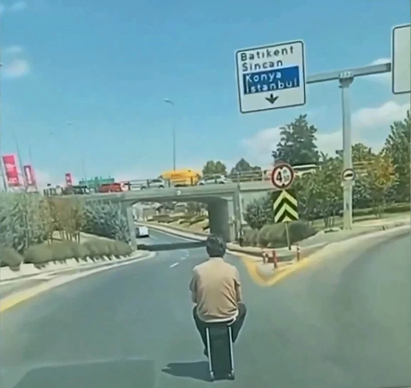 Altındağ ilçesindeki Akköprü kavşağında bir kişi, elektrikli skuter valizle trafikte yolculuk yaptı. Valizle trafikte seyreden kişi, arkasındaki araçtan cep telefonu kamerasıyla kaydedildi. Görüntülerde, valizli kişinin can güvenliğini riske atarak, sağ şeritten ilerlediği anlar yer aldı. (DHA)