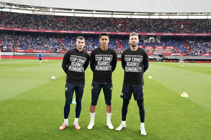 Fenerbahçeli futbolcular maç öncesi ısınmaya ‘Stop crimes aganist humanity’ yazılı siyah tişörtlerle çıktı. Sarı-lacivertli ekibin sosyal medya hesabından bu konuyla ilgili yapılan paylaşımda; “Bizler sadece forma değil, vicdan taşıyoruz. Yurt dışı maçında ısınmaya siyah tişörtlerle çıkıyoruz: “Stop crimes aganist humanity” Susmuyoruz, görmezden gelmiyoruz. İnsanlık nerede yara alıyorsa, orada duruş sergiliyoruz. Çünkü insanlık, sessiz kalınca kaybeder” ifadelerine yer verildi.