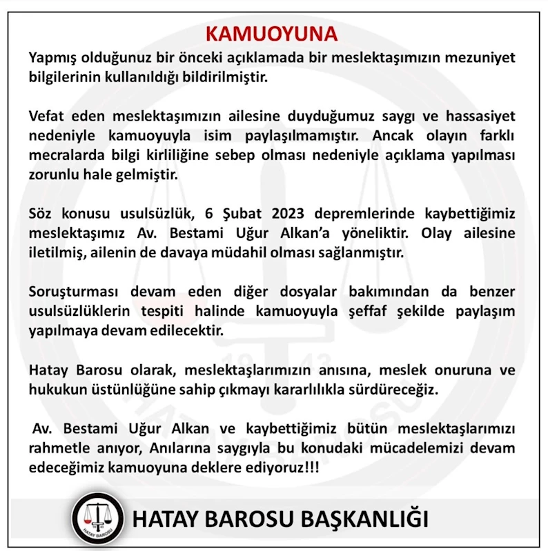 Hatay Barosu tarafından yapılan yazılı açıklamada, "Sahte diploma ve mezuniyet bilgilerinin usulsüz kullanılması soruşturması kapsamında açılan kamu davasında yapılan tespitler sonucunda, depremde vefat eden bir meslektaşımı Bestami Uğur Alkan’ın hukuk fakültesi mezuniyet belgesi üzerinde sahtecilik yapılarak başka bir kişi adına kayıt oluşturulduğu belirlenmiştir. Hatay Barosu olarak bu açık hukuksuzluk karşısında derhal davaya müdahillik başvurusu yapılmasına karar verilmiştir. Ayrıca, soruşturması süren diğer dosyalarda da benzer şekilde vefat eden avukatların bilgileri üzerinde usulsüz işlem yapılıp yapılmadığına dair tespitler oldukça kamuoyu ile paylaşılacaktır" denildi. (DHA)