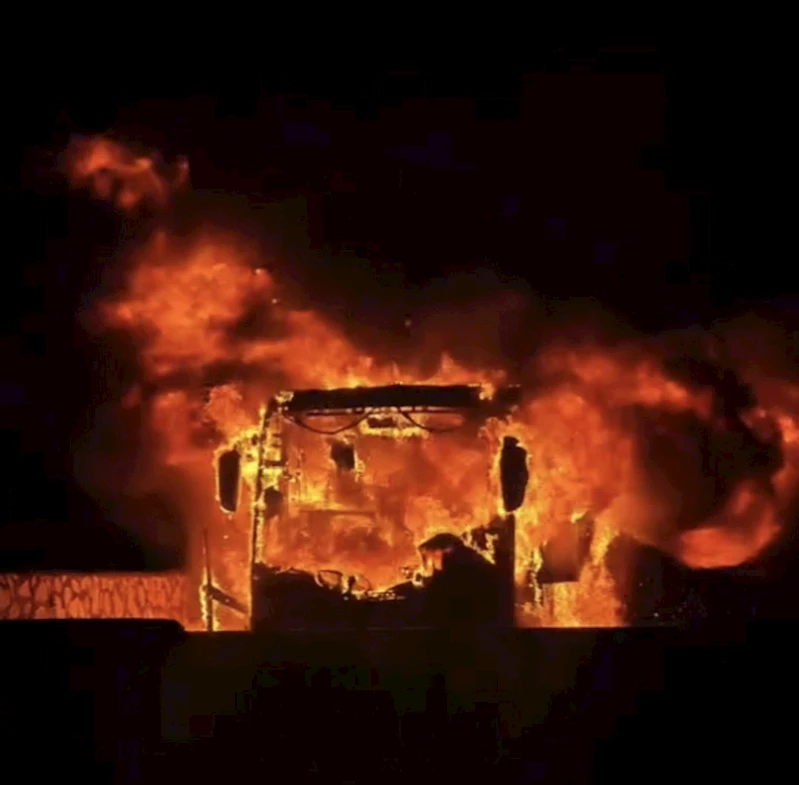 Alican GÜMÜŞ/ HATAY, (DHA)- HATAY'ın Belen ilçesinde seyir halindeyken alev alan yolcu otobüsü, yanarak kullanılmaz hale geldi. Otobüsün alev alev yanması kameraya yansıdı.