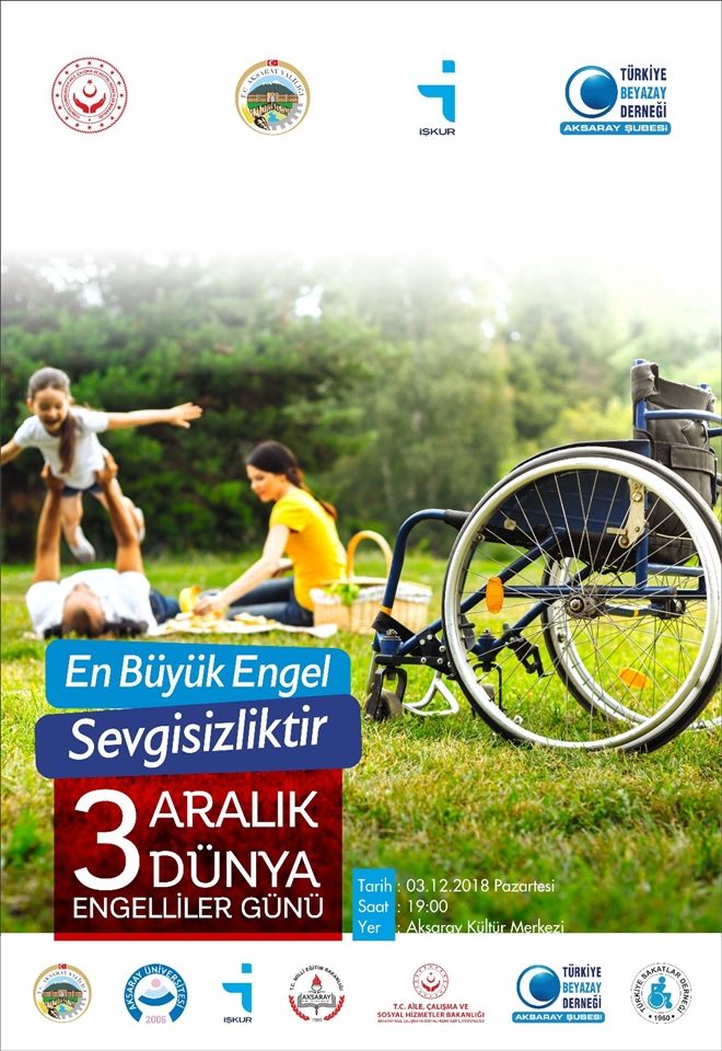 3 Aralık Dünya Engelliler Günü münasebetiyle Aksaray Valiliği himayelerinde Aksaray Çalışma ve İş Kurumu İl Müdürlüğü ile Türkiye Beyaz Ay Derneği iş birlikteliğinde engelli derneklerimizin, çeşitli kurum ve kuruluşların destekleri ile düzenlenen meslek edindirme kursları kapsamında sertifika dağıtım töreni ve engelli kursiyerlerimizin hazırlamış olduğu sergi gerçekleşecektir. Amacımız 3 Aralık Dünya Engelliler Günü farkındalık oluşturarak bugünü özel bir şekilde kutlamak.