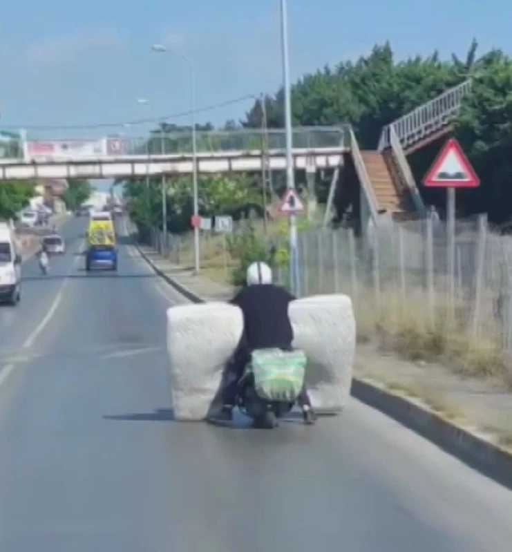 Olay bugün Sultanbeyli TEM Otoyolu Yanyolu üzerinde meydana geldi. Bir kişinin kullandığı motosiklet ile çift kişilik yatak taşıdığı görüldü. Aracın plakasını da arkaya astığı çanta ile kapatan motosikletli, başka bir sürücü tarafından cep telefonu ile görüntülendi. Görüntülerde, sürücünün motosikletin ön tarafına koyduğu yatakla birlikte trafikte ilerlediği görülüyor.(DHA)