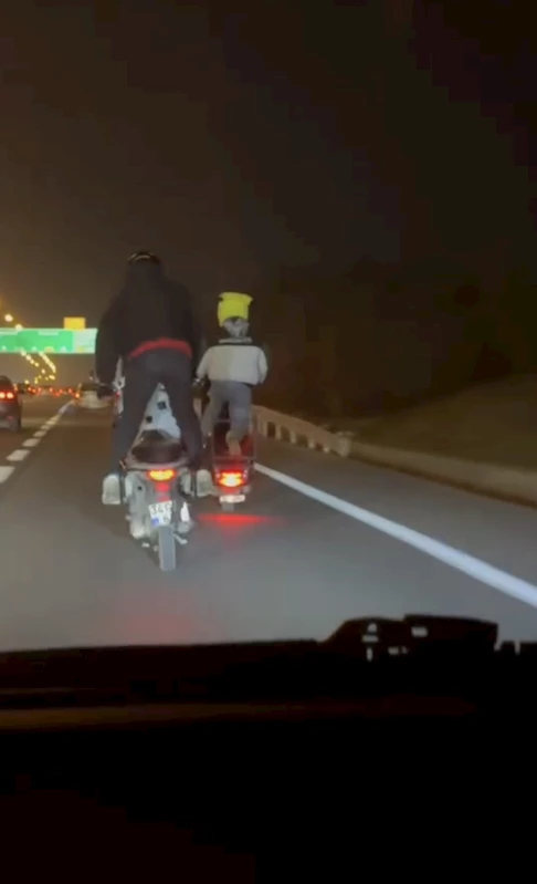 Olay, akşam saatlerinde Ümraniye TEM Otoyolu'nda meydana geldi. Seyir halinde olan iki motosiklet sürücüsü, akan trafikte uzun süre tek tekerlek üzerinde ilerledi. Hem kendi canlarını hem de trafiği tehlikeye atan sürücülerin tehlikeli yolculuğunu başka bir sürücü cep telefonu kamerasıyla saniye saniye kaydetti. (DHA)