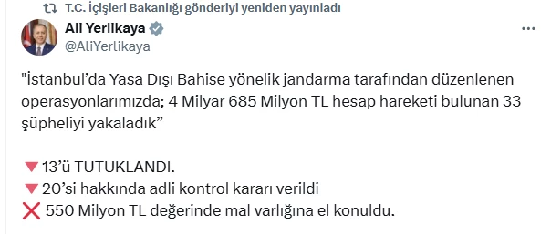 ANKARA, (DHA)- İÇİŞLERİ Bakanı Ali Yerlikaya, İstanbul'da yasa dışı bahse yönelik operasyonlarda, hesaplarında 4 milyar 685 milyon TL’lik hareketlilik bulunan 33 şüphelinin yakaladığını, 13'ünün tutuklandığını açıkladı.