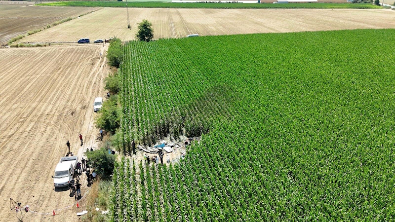 Öte yandan uçağın düştüğü mısır tarlası dronla görüntülendi.