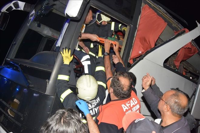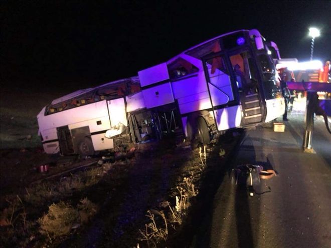 Aksaray´da, kaçak yollarla Türkiye´ye giriş yapan bir grubu, sınır dışı edilmek üzere Suriye sınırına götüren otobüs, kontrolden çıkıp devrildi. Kazada, Suriyeli Muhammed Zenetin Hafez (59) öldü, 17´si polis, 40 kişi yaralandı.