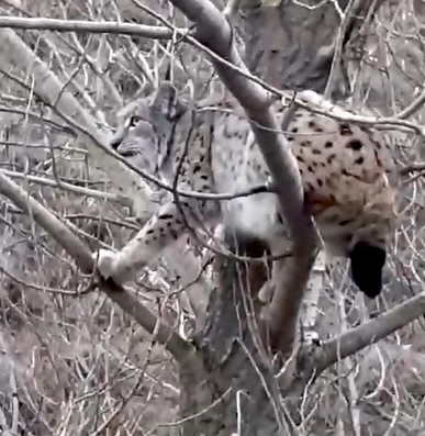 Uğur YİĞİT/SİVAS, (DHA)- SİVAS’ın Yıldızeli ilçesinde, nesli tükenme tehlikesindeki hayvanlar arasında yer alan bir vaşak, Kangal köpeklerinden kaçıp ağaca tırmandı. Ağaçtaki vaşak, cep telefonuyla kayda alındı.