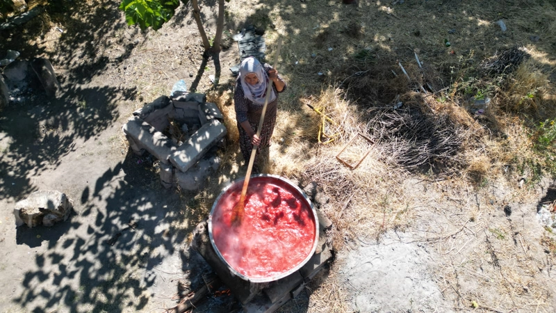 Kumral, "Salça yapmak için buradayız. Kendi ürettiğimiz, yetiştirdiğimiz domatesleri imece usulü yakınlarımızla topladık. Hep beraber olduk. Domatesleri ikiye böldük, torbaladık. Neden torbaladık? Suyu çıksın diye torbaladık. Suyu çıkmayınca salça parlak olmaz. 2 gün bekledi. 2 gün bekledikten sonra çekme makinamız var, onunla hep beraber çektik. Tandırlarımız hazır odun ateşinde, bakır leğenimiz var; kaynatıyoruz. Bakır leğenin özelliği sağlıklı olması. Biz pekmezimizi, salçamızı; kış hazırlıklarımızı bakır leğende yaparız. Lezzeti de aroması da güzel olur" diye konuştu. (DHA)