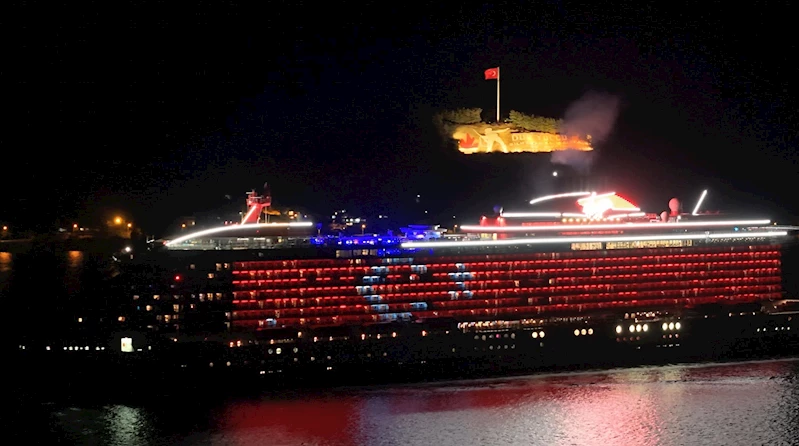 Nazif Cemhan ŞEN/ÇANAKKALE, (DHA)- ÇANAKKALE Boğazı'ndan geçen Bahamalar bayraklı ‘Resilient Lady' isimli kruvaziyer, gövdesinde ışıklarla Türk bayrağı oluşturarak Çanakkale'yi selamladı.