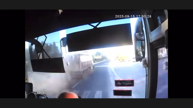 Malatya'nın Darende ilçesinin Ulupınar Mahallesi'nde Salih Eken idaresindeki 41 AOU 373 plakalı TIR'ın freninin boşalması nedeni ile kontrolünü yitirip yolcu otobüsüne çarparak şarampole devrildiği kaza, otobüs içerisindeki güvenlik kamerasına yansıdı. (DHA)