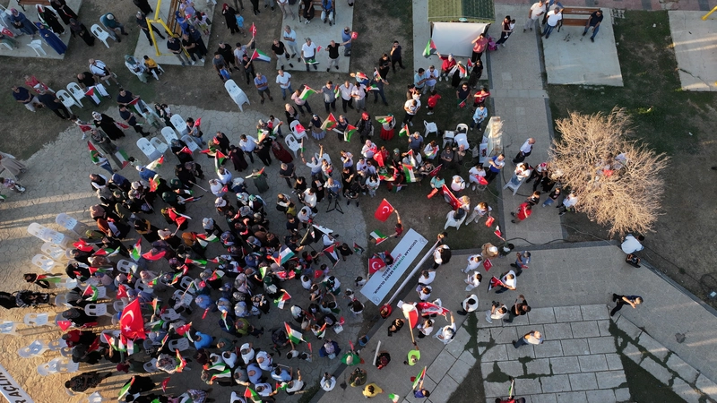 Açıklamaların ardından Akdeniz'de ilerleyen Küresel Sumud Filosu'nda bulunan aktivist Semanur Sönmez Yaman ile telefonla canlı bağlantı yapıldı. Görüntüleri alanda kurulu ekrana yansıtılan Yaman, yolculuklarına ilişkin bilgiler verdi.