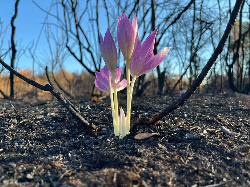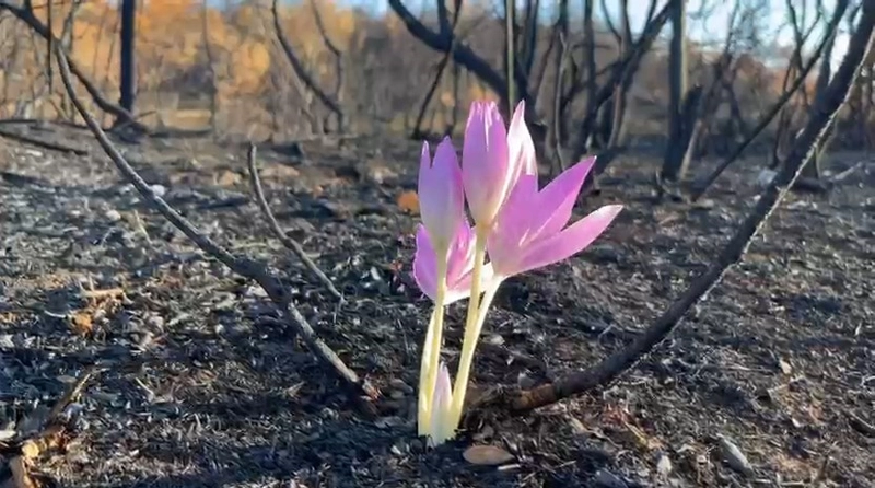 Mine AK/YENİŞEHİR (Bursa), (DHA)-BURSA'nın Yenişehir ilçesinde çıkan ve yaklaşık 100 hektarlık alanın yandığı orman yangını sonrasında açan 'güz çiğdemi', doğa için umut oldu.