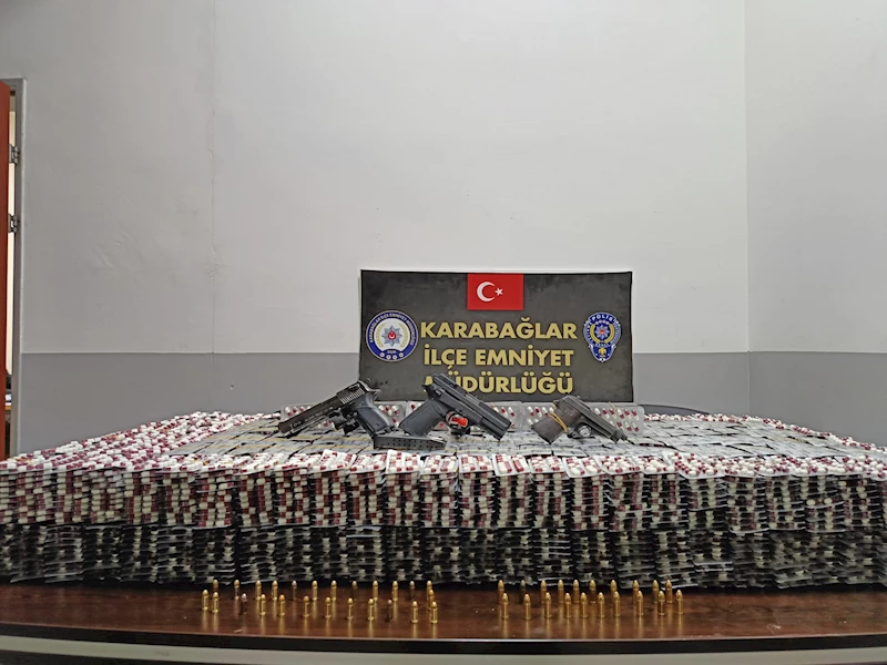 Karabağlar İlçe Emniyet Müdürlüğü Devriye Ekipler Amirliği, 5684 sokakta 2 kişinin bir otomobilde şüpheli hareketlerde bulunduğu bilgisini aldı. Bunun üzerine harekete geçen ekipler, ihbarın yapıldığı sokağa giderek şüphelilerin olay yerinde olmadığını, otomobilin ise park halinde olduğunu tespit etti. Polis, yaptığı incelemede, otomobilin arka koltuğunda çok sayıda sentetik ecza bulunduğunu belirledi. Savcılıktan alınan talimat ile otomobilin sahibi G.E. ve oğlu A.E., Konak'taki adreslerinde yakalanarak gözaltına alındı. Otomobilde yapılan aramada ise 46 bin 195 sentetik ecza ile 3 ruhsatsız tabanca ve 45 fişek ele geçirildi.