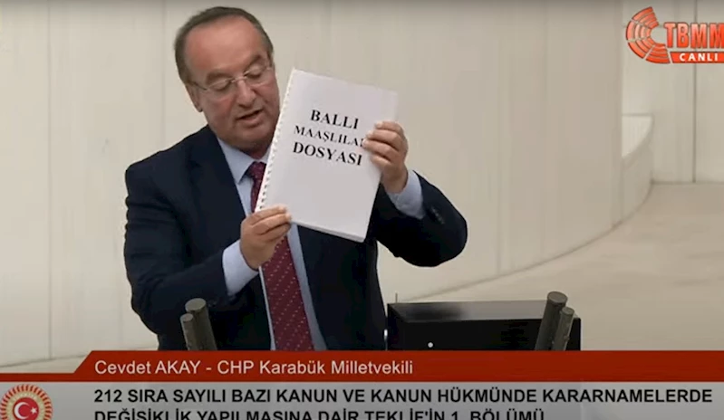 Genel Kurul'da, milletvekillerinin 1'er dakikalık değerlendirmeleri, grup başkanvekillerinin gündeme ilişkin açıklamaları ve grup önerilerinin görüşmelerinin ardından kanun teklifi görüşmelerine geçildi. Bu bölümde CHP grubu adına söz alan Karabük Milletvekili Cevdet Akay, "Ben bugün burada sizlere bunu göstereceğim. Kürsüde gördüğünüz sadece bir kasa değil, bu kasa bu milletin rızkı, bu ülkenin umudu, geleceğidir. Bu kasa bir çocuğun sütüdür, bir annenin duasıdır, bir babanın onurudur. İktidar maalesef bu kasayı koruyamadı, milletin kasasını 3-5 yandaşa, rant düzenine, ihaleci zümreye teslim etti. Bu kasanın içinde bir dosya ve uzun bir liste var. Bu kasanın içine sızmış, kasaya vantuz gibi yapışan kişileri herkes bilsin, görsün diye milletimizin kürsüsünden açıklıyorum. Dosya kabarık, liste uzun, 54 metrelik liste. Bu kaynakların nasıl harcandığı, nasıl heba edildiği, nasıl hiç edildiği; devletin kasasına vantuz gibi yapışanların kimler olduğu, kendi siyasi ikballeri için milletin rızkına göz dikenlerin olduğu, kapısından geçtiği için bürokrasiye yerleştirilenlerin olduğu, AKP'de siyaset yaptığı için devlette en üst görevlere gelenlerin, getirenlerin olduğu bir kasa, liste ve dosya var. Bakanlıktan çıkıp milyonluk ihaleyi verdiği şirkete yönetici olanlar var. Kamu kurumlarından aynı anda 3-4-5 maaş alanlar var. Aynı anda kamu kurumlarının çeşitli birimlerinde çalışıp 3-5 maaş alıp halkın sırtında kambur olanlar var" dedi.