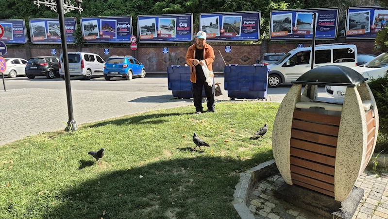Alaplı ilçesinde belediyenin temizlik işçisi olarak çalışan 2 çocuk babası Turgay Ertürk, her sabah süpürge ve küreğiyle cadde ve sokakları temizliyor. Ertürk, çalıştığı sırada çöpe atılan bayat ekmekleri özenle toplayıp parka gidiyor ve güvercinleri elleriyle besliyor. Hem hayvan sevgisiyle hem de israfın önüne geçme düşüncesiyle bu alışkanlığını sürdürdüğünü söyleyen Ertürk, "Onları ellerimle beslemek bana huzur veriyor. Çöpe atılan ekmek atıklarına çok üzülüyorum. Göreve başladığım ilk günden bu yana, çöp kutularının kenarına bırakılan ekmekleri toplamaya özen gösteriyorum. Elimden geldiğince güvercinleri ve diğer sokak hayvanlarını aç bırakmamaya çalışıyorum" dedi.