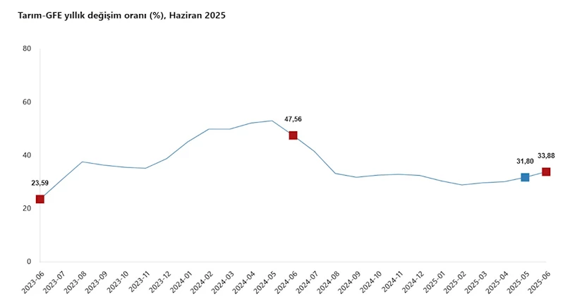 TÜİK, Haziran 2025 dönemine ilişkin tarımsal girdi fiyat endeksi verilerini açıkladı. Buna göre; tarımsal girdi fiyatları, 2025 yılı Haziran ayında bir önceki aya göre yüzde 2,52, bir önceki yılın aralık ayına göre yüzde 17,88, bir önceki yılın aynı ayına göre yüzde 33,88 ve 12 aylık ortalamalara göre yüzde 32,27 arttı.