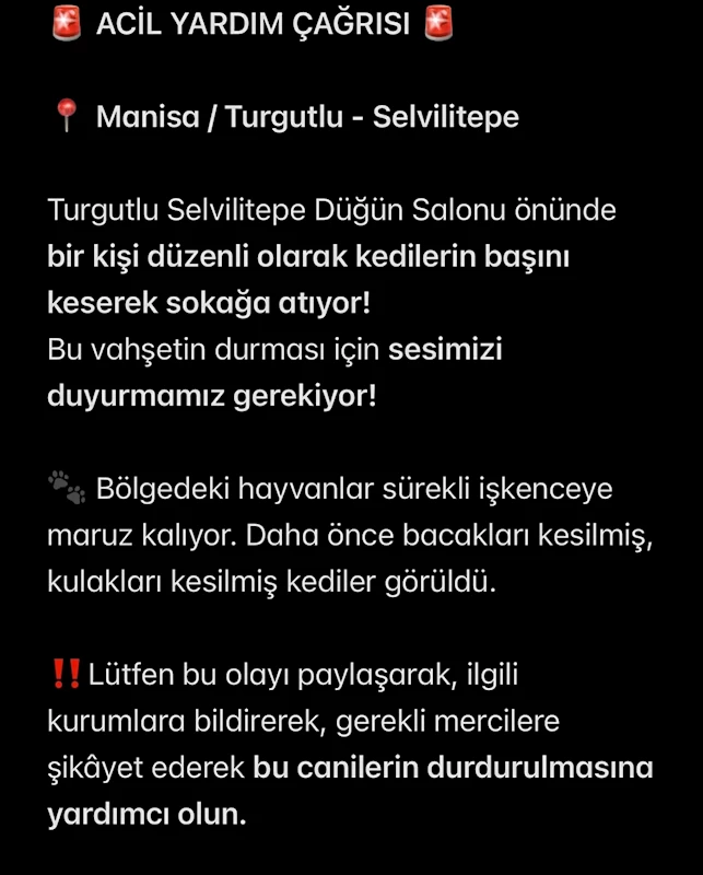 Doğan ÇİZMECİ/TURGUTLU (Manisa), (DHA)- MANİSA'nın Turgutlu ilçesinde, sokakta bir kedi başı bulunduğu iddiası, hayvanseverlerin tepkisine yol açtı. Sosyal medyadan paylaşılan görüntüler üzerine bölgeye giden ekipler, herhangi bir ize rastlamadı.