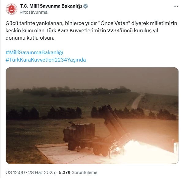 Bakanlığın sosyal medya hesabından yapılan paylaşımda, "Gücü tarihte yankılanan, binlerce yıldır 'Önce vatan' diyerek milletimizin keskin kılıcı olan Türk Kara Kuvvetlerimizin 2 bin 234'üncü kuruluş yıl dönümü kutlu olsun" denildi. Paylaşımda ayrıca, Kara Kuvvetleri Komutanlığı'nın operasyonlarına ilişkin görüntülere yer verildi.