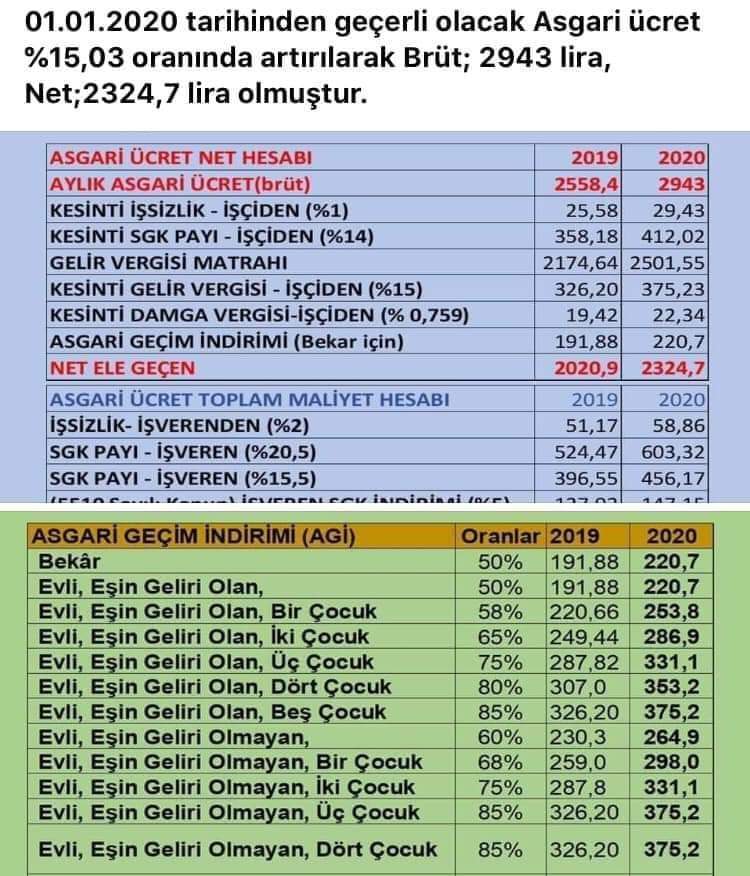 Bakan Selçuk, açıklamasında, asgari ücretin 2020 yılı için brüt 2 bin 943 lira, net 2 bin 324 lira olarak belirlendiğini açıkladı. Selçuk, evli ve üç çocuklu bir işçi için asgari ücretin 2 bin 479 lira 21 kuruş olduğunu söyledi.